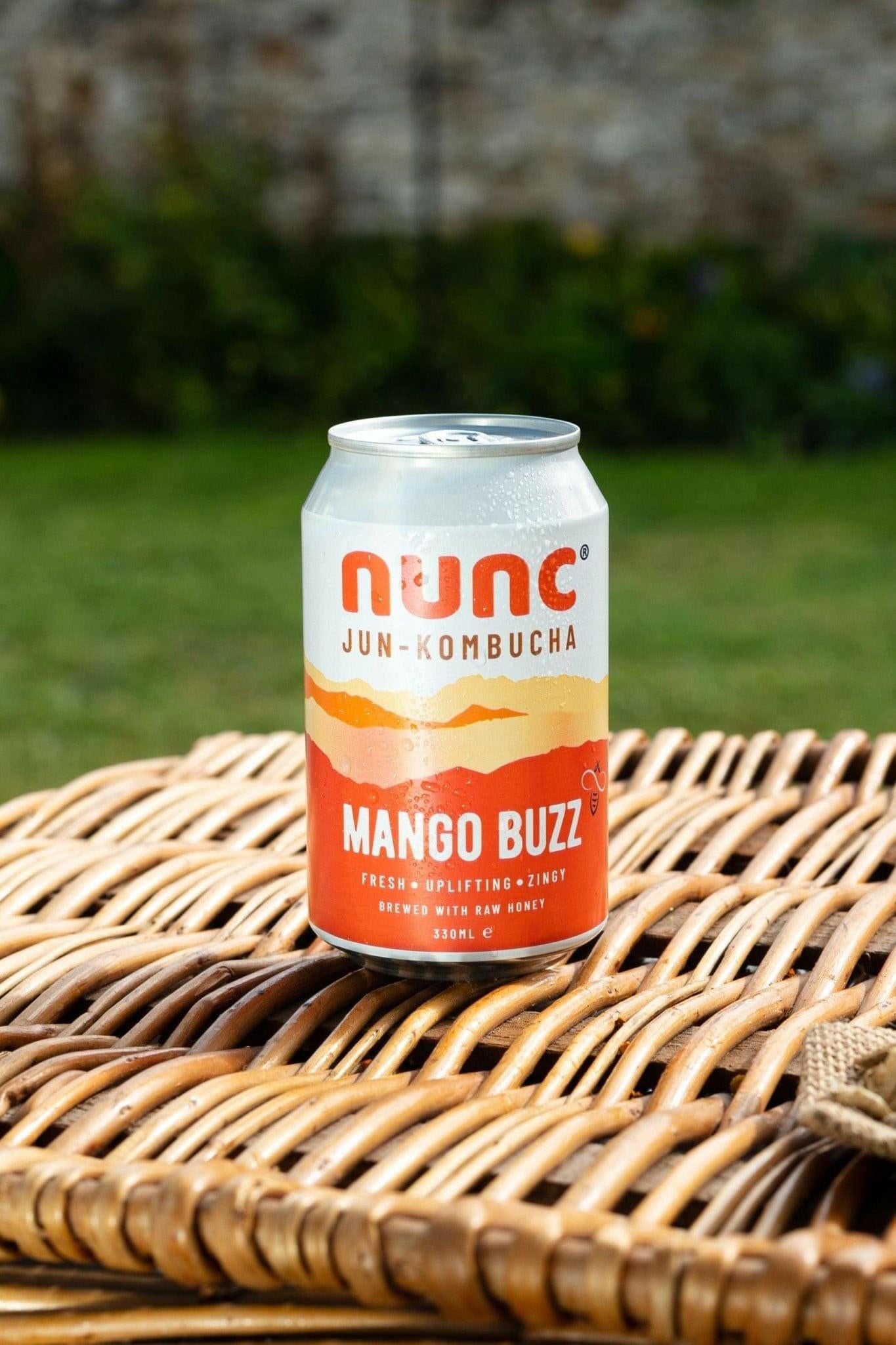 Mango Buzz is a Jun Kombucha (a sparkling tea drink), made by fermenting two types of organic green teas with raw honey from within 5 miles of our brewery in Buckingham, Buckinghamshire. We infuse our kombucha with organic mango, organic ginger, organic turmeric and organic white peppercorns. All that goodness and flavour, and only 30 calories per can!